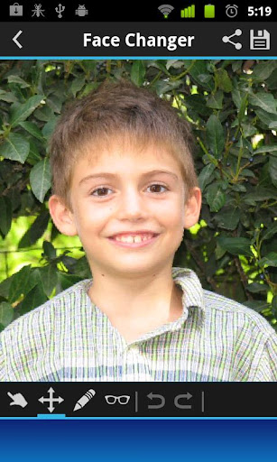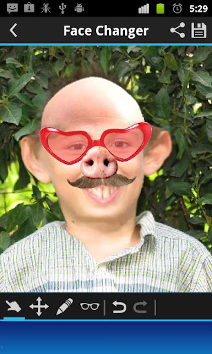 * Nesne aracı: Fotoğrafın üzerine bir nesne yapıştırın. Uygulama birçok nesne seçeneğiyle birlikte gelir: Gözlük, farklı göz renkleri, komik burunlar, ağızlar, sakallar, yaralar, sivilceler ve diğer pek çok nesne. Farklı kel kafa seçenekleriyle resmi dazlak yapın. Tıpkı Bald Booth uygulamasında olduğu gibi ancak daha pürüzsüz şekilde ve daha fazla seçenek kullanarak.
